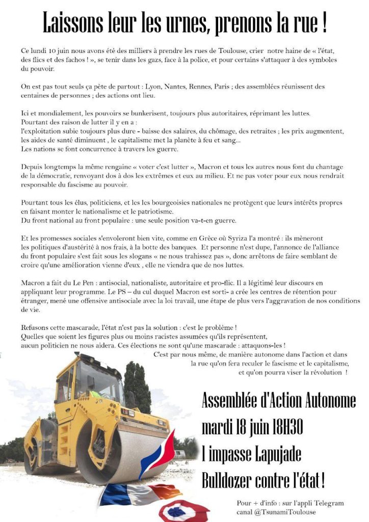 Por ello, proponemos reunirnos el martes 18 de junio a las 18:30 en l’impasse (1 impasse lapujade, barrio de bonnefoy) para ver cómo podemos organizarnos contra este contexto electoral.