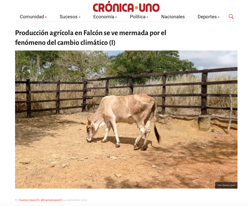 López Chirinos, J. (25 de septiembre de 2023). Bovinos en Falcón padecen por la falta de alimentos (y II). Crónica Uno. https://cronica.uno/sequia-pone-en-jaque-a-criadores-de-ganado-de-falcon/