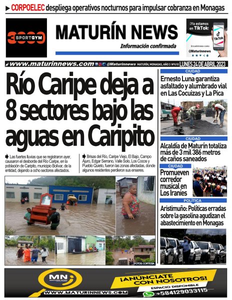 Figura 30: Inundaciones en el Río Caripito en Monagas. Fuente: Portada del diario Maturín New 23 de abril de 2023