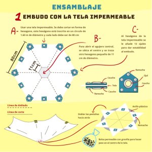 Este dispositivo que les presentamos a continuación está compuesto por un embudo de tela impermeable con una base estructural de tubos pvc, que puedes sustituir por bambú, esta estructura da estabilidad al embudo y, ayuda a la caída del agua a la boca del tanque de 900 litros que tiene una capacidad de riego para un terreno de pequeña escala o una hectárea. Te sugerimos tomar en cuenta las características y necesidades que tendrá tus cultivos y las ETC (evapotranspiración del cultivo).