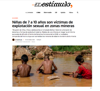 Entre las terribles secuelas de la minería en Venezuela está la explotación sexual de niñas en el contexto de la explotación de minerales en el Arco Minero del Orinoco. De acuerdo a estudios8, esta situación se ha agudizado de manera que la edad de inicio en el trabajo sexual en las minas ha disminuido, encontrándose casos de niñas hasta de 7 años.