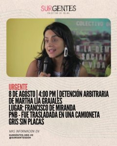 Caracas, 8 de agosto de 2025. Aproximadamente a las 4 de la tarde del día de hoy, Martha Lía Grajales, activista de la organización de derechos humanos Surgentes, fue secuestrada violentamente por presuntos funcionarios de la Policía Nacional Bolivariana, y trasladada a un sitio desconocido en una camioneta gris sin placas.